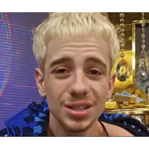 Homem loiro com expressão surpresa ou confusa, usando um colar e uma camisa azul com padrão. Fundo com decorações douradas e uma tela roxa.