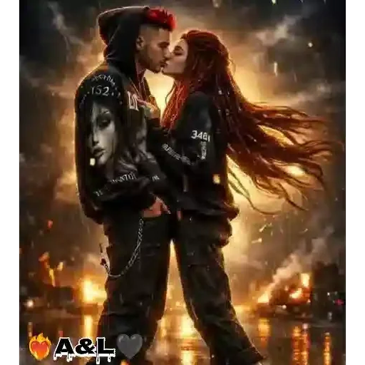 Um casal se beijando em frente a um cenário de destruição e incêndios, com o homem vestindo uma jaqueta com uma estampa de rosto e a mulher com cabelos longos e ondulados. Ao canto, há um logo com as letras 'A&L'.