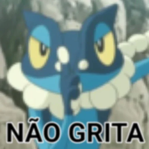 Um personagem de Pokémon, um lynx azul com olhos amarelos e uma expressão séria, com o texto 'NÃO GRITA' em letras pretas.