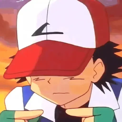 Personagem de anime com boné vermelho e branco, olhos semicerrados e mãos apontando para frente.