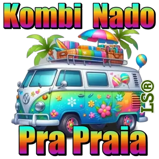 Uma van Kombi decorada com flores e estrelas, carregada com uma prancha de surfe e guarda-sol, com a frase 'Kombi Nado Pra Praia' em letras coloridas.