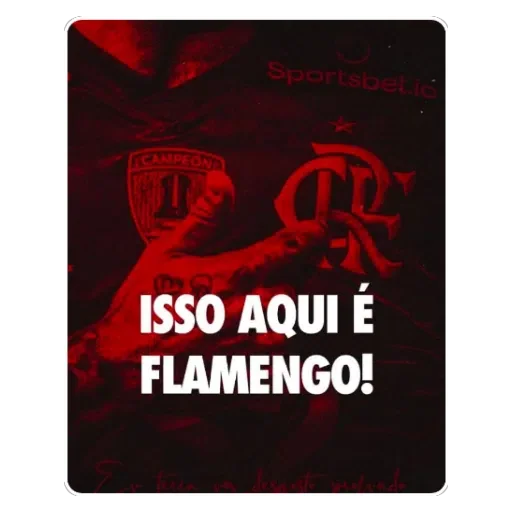 Um fundo vermelho escuro com uma figura em vermelho mais claro ao fundo e o texto "ISSO AQUI É FLAMENGO!" em branco.