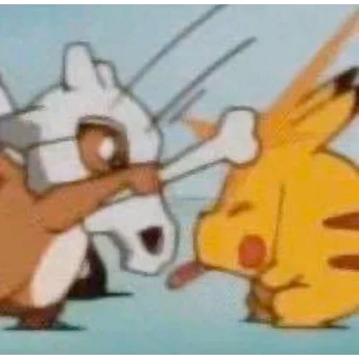 Um sticker de duas personagens de Pokémon, um Pikachu amarelo com expressão surpresa e um outro personagem com focinho branco e marrom, com um osso branco na boca prestes a atingir o Pikachu.