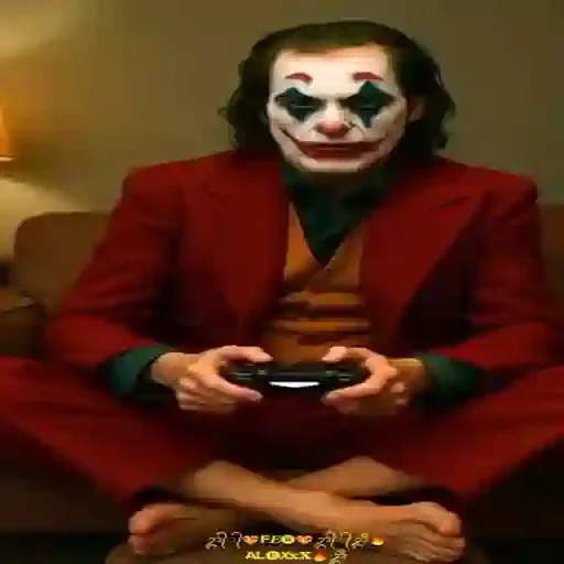 O Coringa, caracterizado por Joaquin Phoenix, sentado em um sofá com um controle de videogame, usando um terno vermelho e maquiagem branca no rosto.