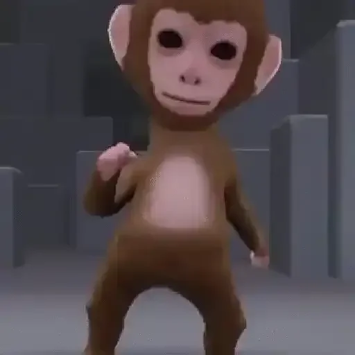 Um macaco de pelúcia marrom com olhos grandes e orelhas grandes, em uma pose de dança em um fundo cinza.