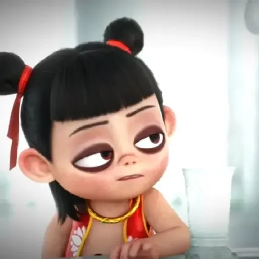 Menina de olhos castanhos e cabelos pretos com duas bolas, vestindo uma camiseta vermelha com detalhes em amarelo.