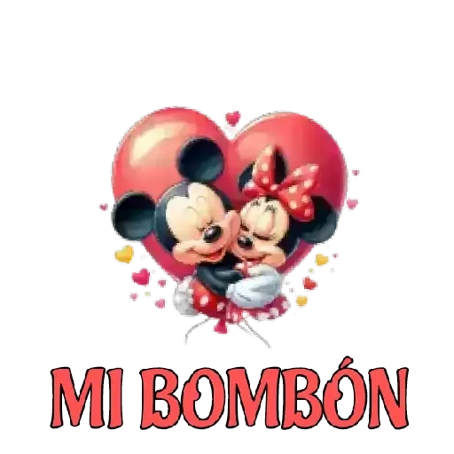 Mickey e Minnie Mouse se abraçando dentro de um coração vermelho com balões, rodeados de corações menores. Abaixo deles, está escrito 'MI BOMBÓN' em letras vermelhas.