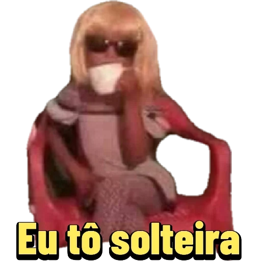 Uma mulher loira com óculos de sol sentada em uma cadeira vermelha, com a expressão séria e o texto 'Eu tô solteira' em amarelo na parte inferior.