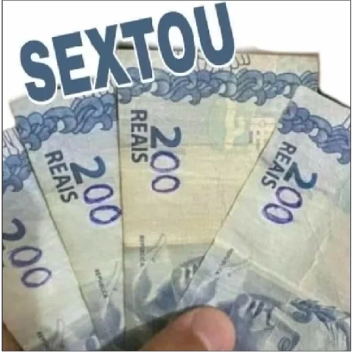 Três notas de 200 reais com a palavra 'SEXTOU' em letras grandes em cima.