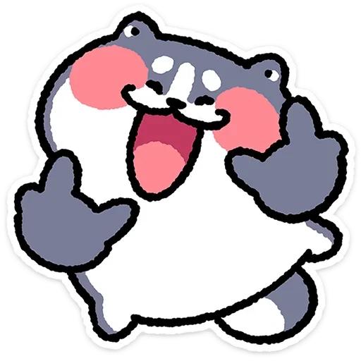 Um desenho de um animal cartoon com corpo branco e manchas cinzas, orelhas pequenas, olhos pequenos, bochechas rosadas e língua para fora, com as mãos levantadas.