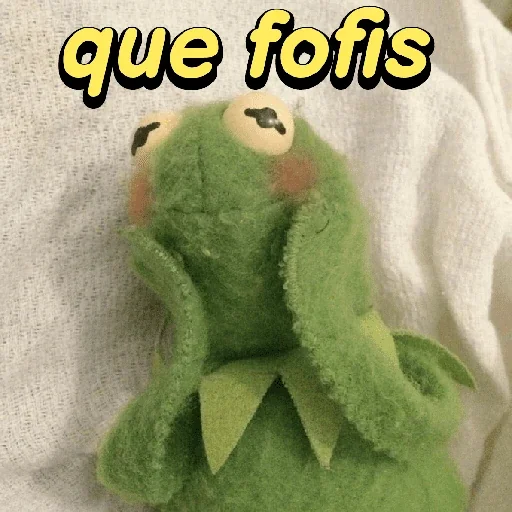 Um ursinho de pelúcia verde, parecido com o Kermit, com a frase 'que fofis' em amarelo com contorno preto.