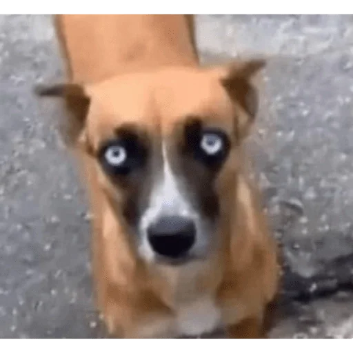 Cachorro com olhos azuis e pelagem castanha, focinho branco e preto, olhando para cima com expressão curiosa.
