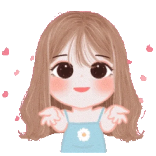 Garota de olhos grandes e cabelo castanho, usando um vestido azul com uma flor, rodeada de corações rosa.