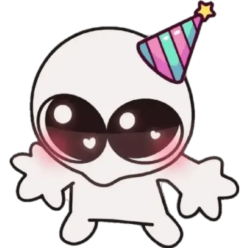 Um esqueleto fofinho com olhos grandes e um chapéu de festa colorido na cabeça.