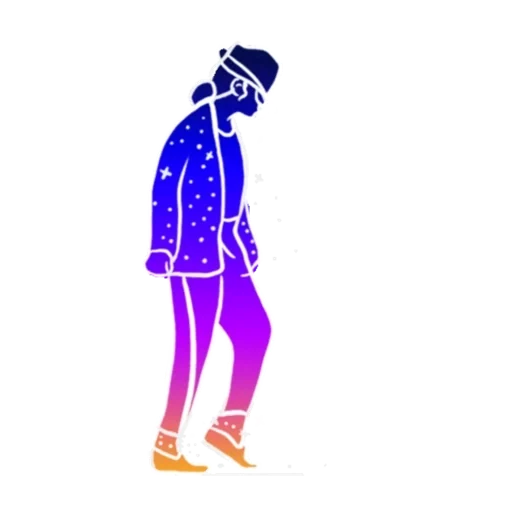 Uma pessoa com jaqueta e óculos de sol, com um degradê de cores roxo e laranja, andando com a cabeça baixa.