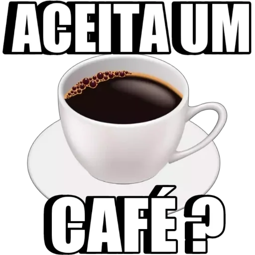 Um bule de café branco com café preto e uma pergunta 'Aceita um café?' em letras grandes.