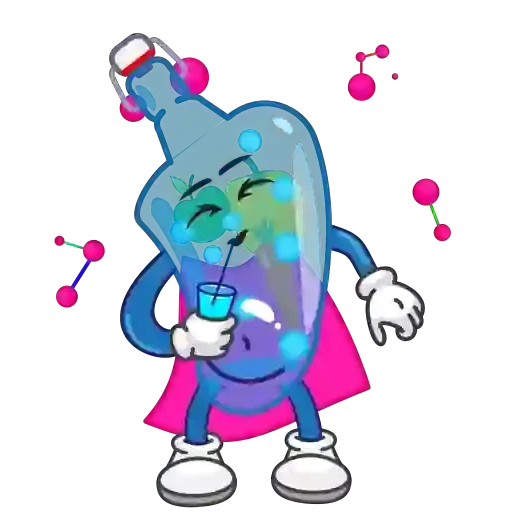 Um desenho de uma garrafa de água com expressão de dor de estômago, usando uma capa rosa e com moléculas ao redor.