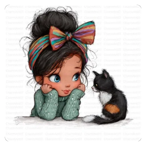 Menina com um laço colorido na cabeça e um suéter verde olhando para um gato preto e branco com uma mancha laranja.