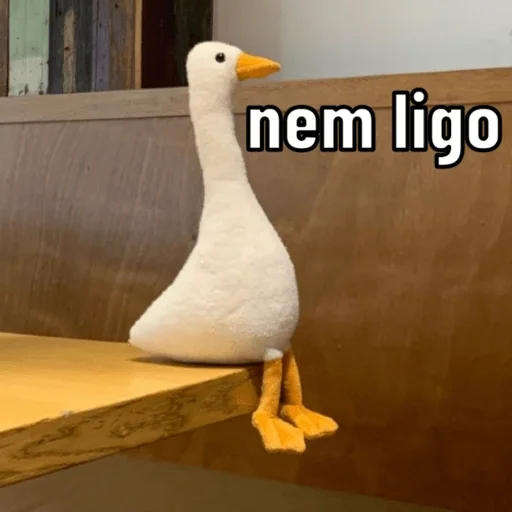 Um pato branco com bico e pés laranjas senta-se em uma prancha de madeira, com o texto 'nem ligo' sobreposto.