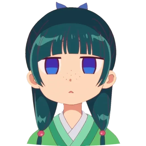 Garota de anime com cabelos verdes escuros em duas tranças e olhos roxos, vestindo um kimono verde.