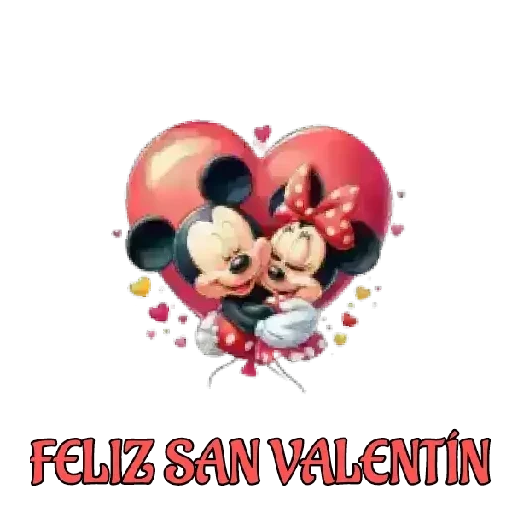 Mickey e Minnie Mouse se abraçando dentro de um coração vermelho, rodeados de corações menores. Abaixo deles, está escrito 'Feliz San Valentín'.