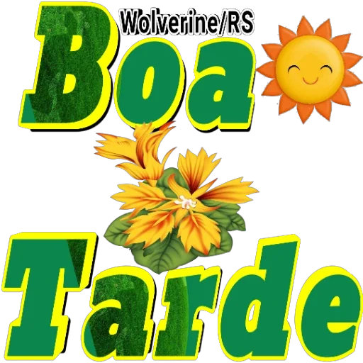 Uma saudação de 'Boa Tarde' com flores amarelas e um sol sorridente, com o texto 'Wolverine/RS' em cima.