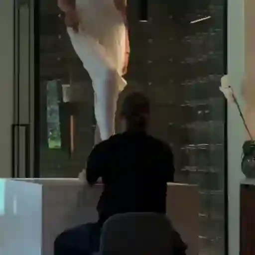 Um homem de costas, deitado de bruços em uma mesa ou balcão, com uma perna levantada. Ele parece estar em uma posição relaxada ou talvez sonhando.