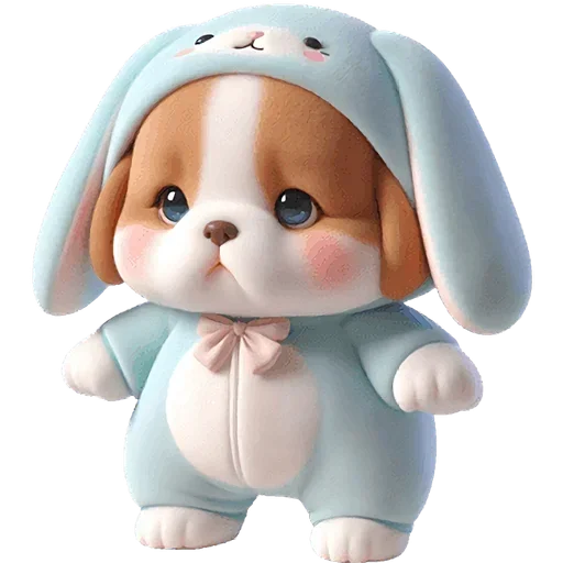 Cachorro fofinho vestido com macacão de coelho azul e rosa, com olhos grandes e bochechas rosadas.