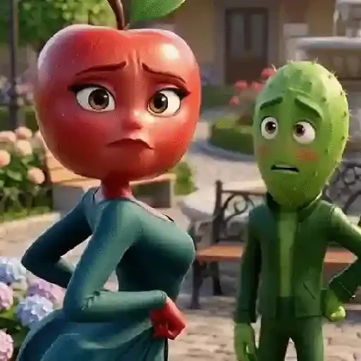 Uma maçã vermelha com expressão séria e um vegetal verde com cara de desapontado ao lado, ambos com aparência de personagens de desenho animado em um cenário de jardim.