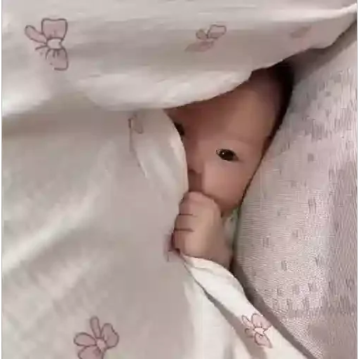 Um bebê está deitado debaixo das cobertas com apenas um olho e uma mão visíveis. A coberta é branca com flores rosa.
