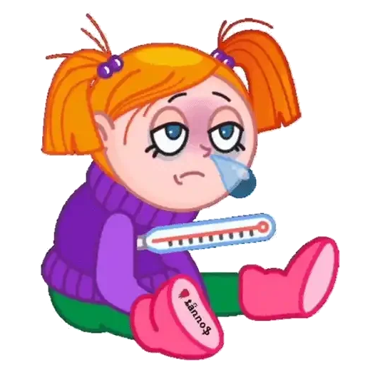 Menina de cabelos laranjas em pigtails, com um termômetro na mão e outro no nariz, vestindo suéter roxa, calça verde e botas rosa. Ela parece doente.