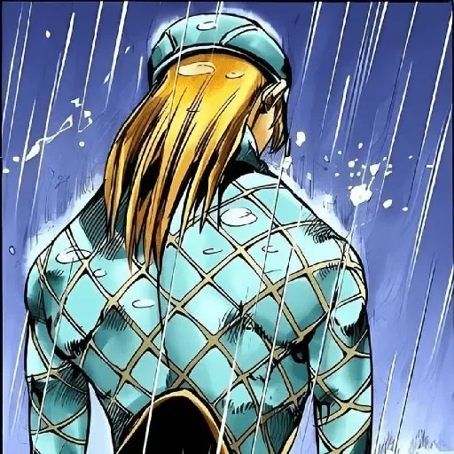 Personagem de anime com cabelo loiro e roupa azul xadrez, em pé sob a chuva.