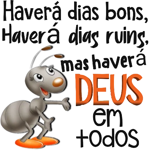 Um desenho de um inseto cinza com expressão feliz ao lado de uma mensagem de motivação que diz 'Haverá dias bons, Haverá dias ruins, mas haverá DEUS em todos'.