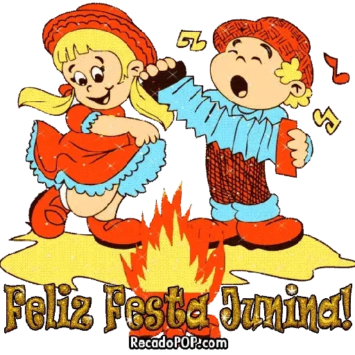 Dois personagens infantis, um menino e uma menina, dançando em volta de uma fogueira com a frase 'Feliz Festa Junina!'
