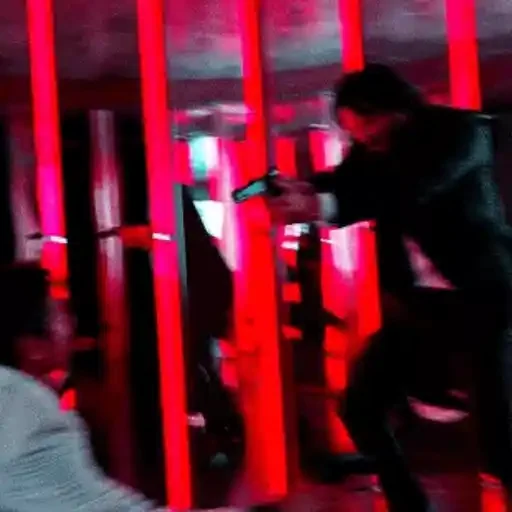 Um homem de preto atirando em alguém em um ambiente com luzes vermelhas.