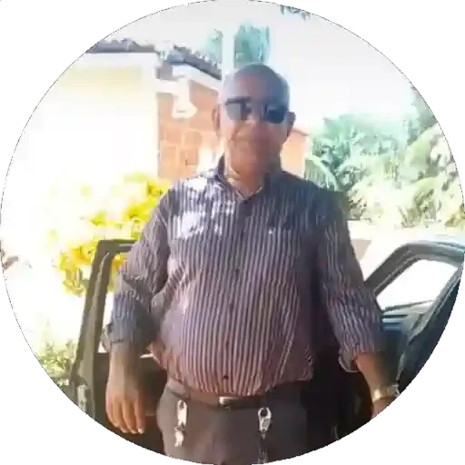 Homem de meia-idade com camisa azul e branca de flores, sorrindo, em frente a uma coluna com uma corrente.