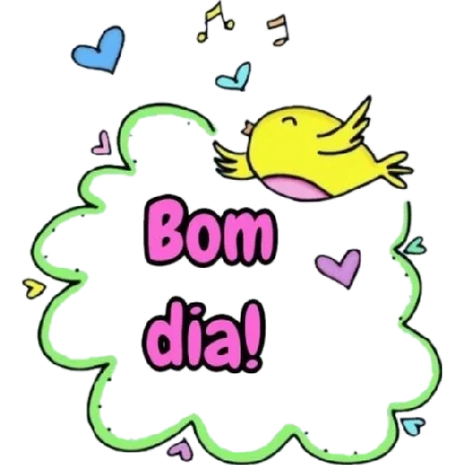 Um passarinho amarelo voando em meio a corações e notas musicais, com a frase 'Bom dia!' em destaque.