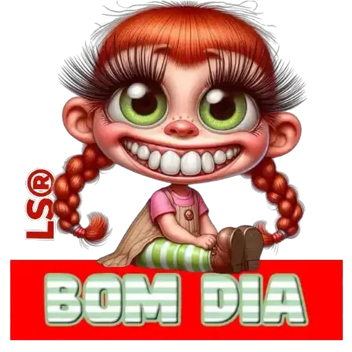 Menina de olhos verdes e cabelos ruivos em tranças sorrindo com dentes grandes e brancos. Ela veste uma blusa rosa e está sentada em uma faixa verde e branca. Abaixo dela, há uma faixa vermelha com 'BOM DIA' em letras grandes.