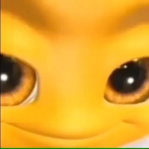 Rosto de um personagem amarelo com olhos grandes e expressivos, parecendo um sorriso leve.