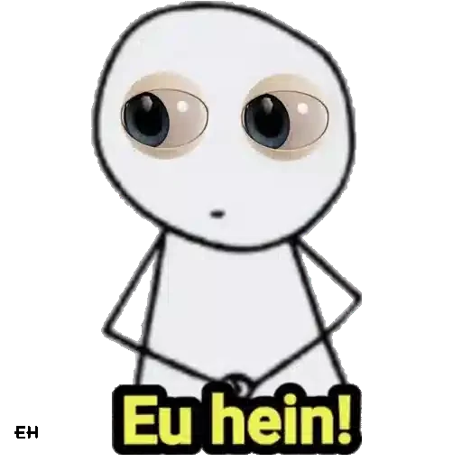 Um desenho de um boneco com olhos grandes e expressão surpresa, com a frase 'Eu hein!' em amarelo.