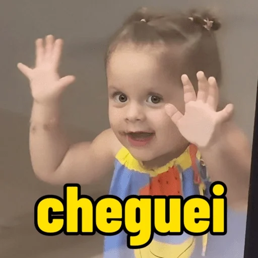 Menina pequena com as mãos levantadas e a palavra 'cheguei' em destaque.