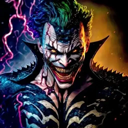 O Coringa com uma expressão de raiva, cabelo verde e maquiagem branca e preta no rosto, com um fundo laranja e raios roxos.