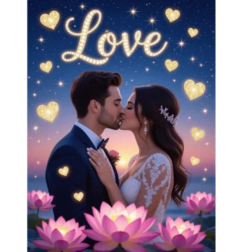 Um casal se beijando ao pôr do sol, com flores de lótus e corações dourados ao redor. A palavra 'Love' está escrita acima deles.