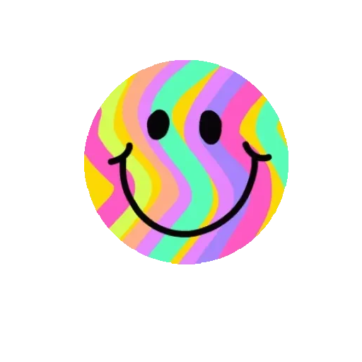 Um rosto sorridente colorido com listras em tons de rosa, amarelo, verde e azul, com olhos pretos e um sorriso preto.