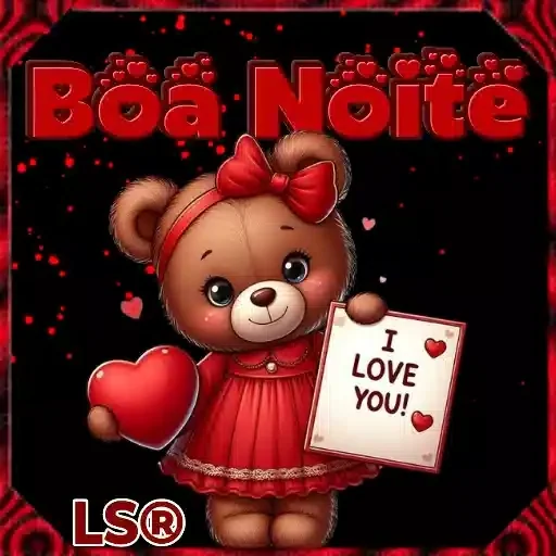 Um ursinho de pelúcia marrom com um laço vermelho na cabeça e uma dress vermelha segura um coração e um cartão com a mensagem 'I LOVE YOU!' em um fundo preto com estrelas e contorno vermelho.