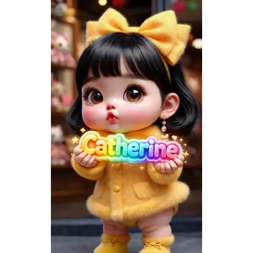Menina fofa com cabelo preto e laço amarelo, vestida de amarelo, segurando um sinal com o nome 'Catherine' colorido.