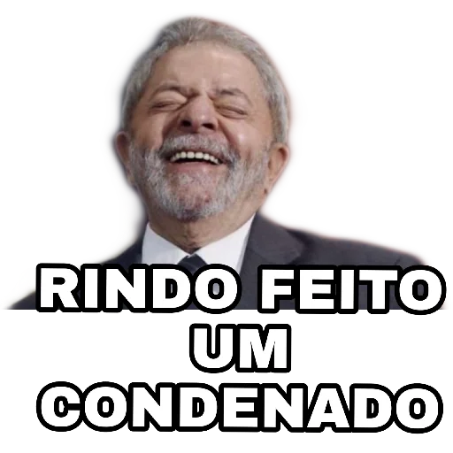 Um homem mais velho, com cabelo grisalho e terno, sorrindo com os olhos fechados. Abaixo dele, está escrito 'RINDO FEITO UM CONDENADO'.