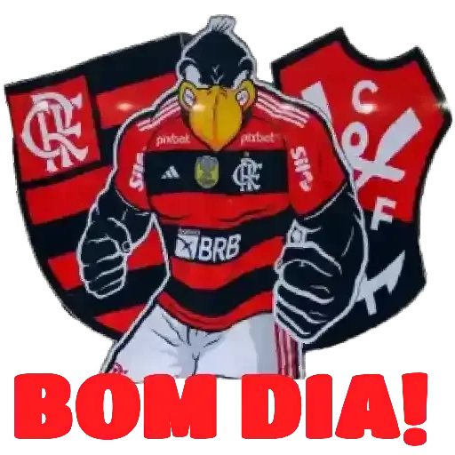 Um mascote de um time de futebol com um bico grande e olhos arregalados, vestindo uma camisa vermelha e preta, com o texto 'BOM DIA!' em letras grandes vermelhas.