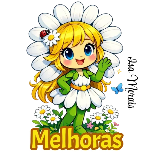 Uma menina de cabelos loiros com uma flor na cabeça e um vestido de flor, com a palavra 'Melhoras' embaixo. Ela tem um sorriso no rosto e uma mão levantada.