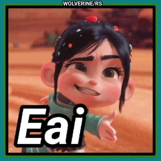 Uma menina de cabelo preto com confetes vermelhos e brancos está sorrindo e fazendo um gesto com a mão. A palavra 'Eai' está escrita em branco com contorno preto.